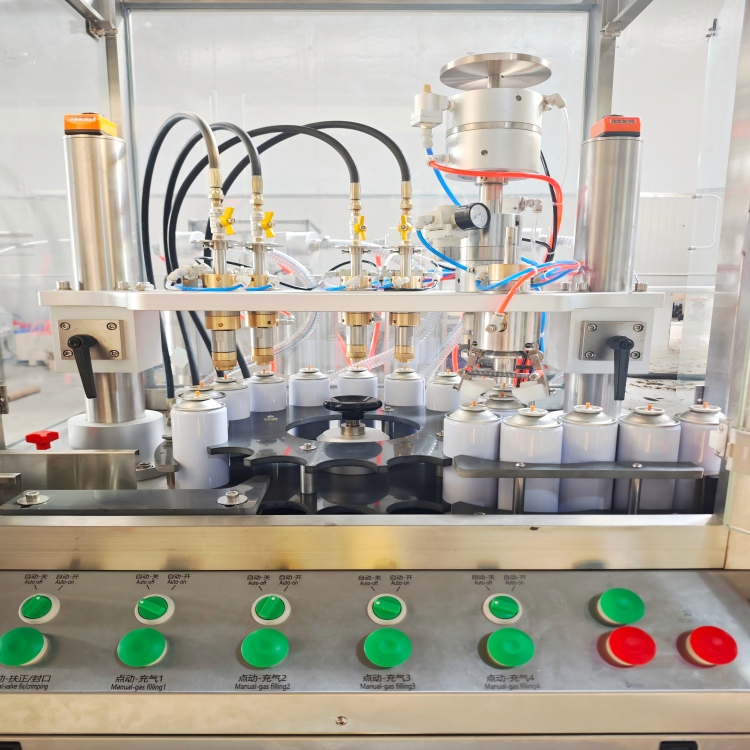 propellant gas filling process of aerosol products. Driven by compressed air, it realizes fully automatic, high-precision